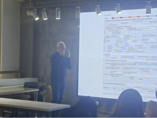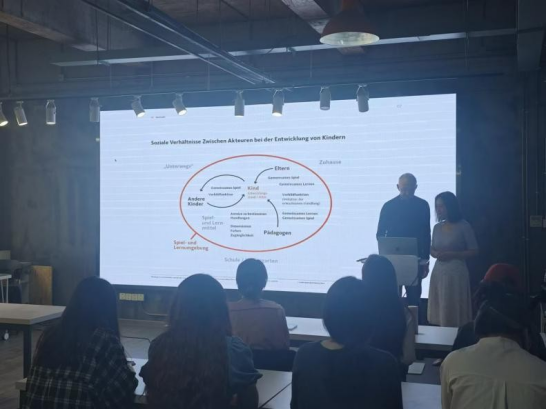 Papenfuss教授讲述了儿童在成长不同阶段关于绘画和写作的认知发展、运动功能和系统、游戏和学习的形式的特点。程文婷教授为了听众能更好理解,讲述了儿童在"玩中学"的例子,并分析了儿童在不同成长阶段的特性。
