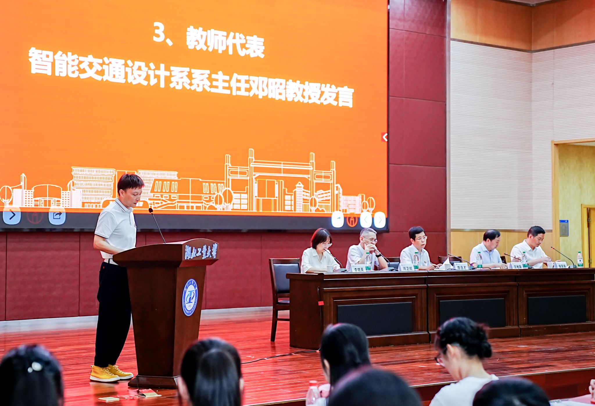 教师代表智能交通设计系系主任邓昭教授鼓励同学们要志存高远、扎实基础、敢于创新、团结协作,营造和谐愉悦的学习生活环境。