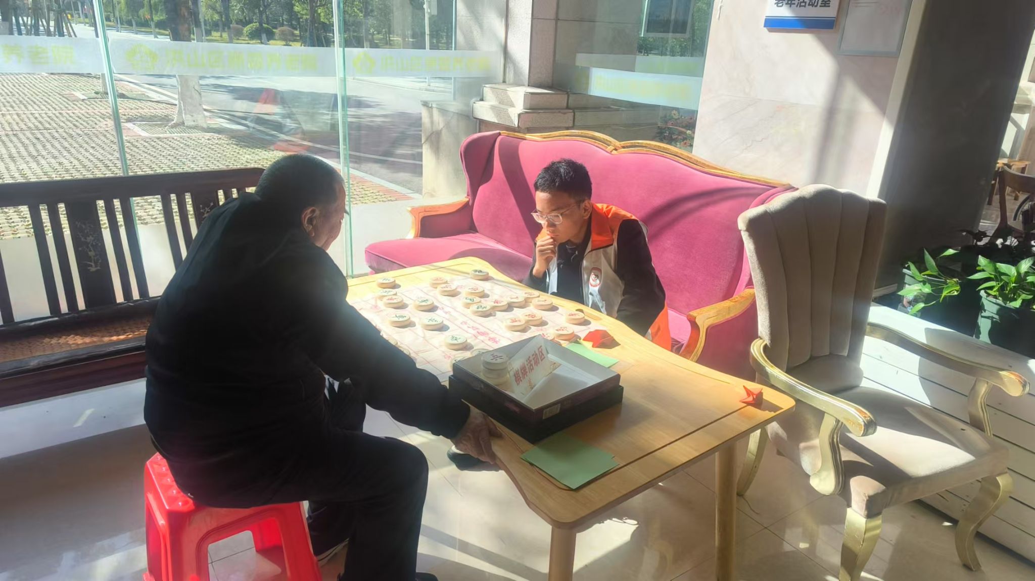 活动尾声,志愿者们与老人们展开象棋对弈。棋盘之上,红黑棋子交织,老人们凝神思考,果断落子,尽显智慧风采。
