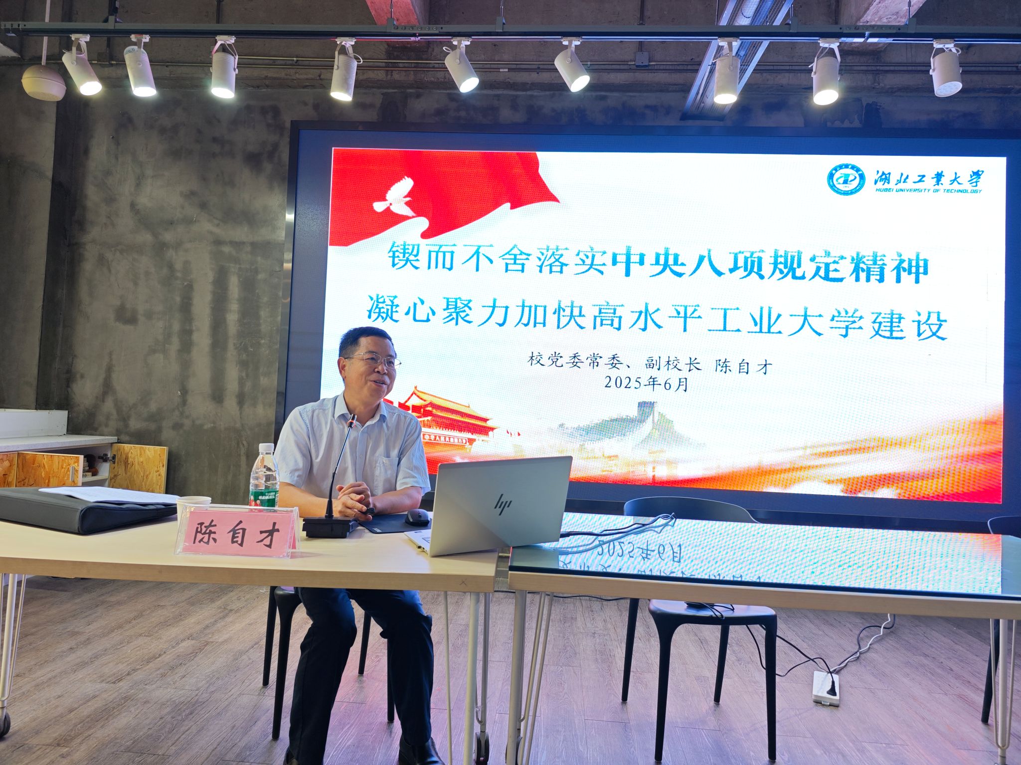 6月18日,校党委常委、副校长陈自才莅临工业设计学院,以“锲而不舍落实中央八项规定精神,凝心聚力加快高水平工业大学建设”为主题讲授专题党课。学院领导班子、系主任、党支部书记参加学习,会议由党委书记王地国主持。